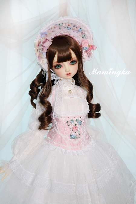 今回のエリナドレスはピュアホワイト色のひらひらしたドレスとパステルトーンの華やかなボンネットがポイントのドレスです。